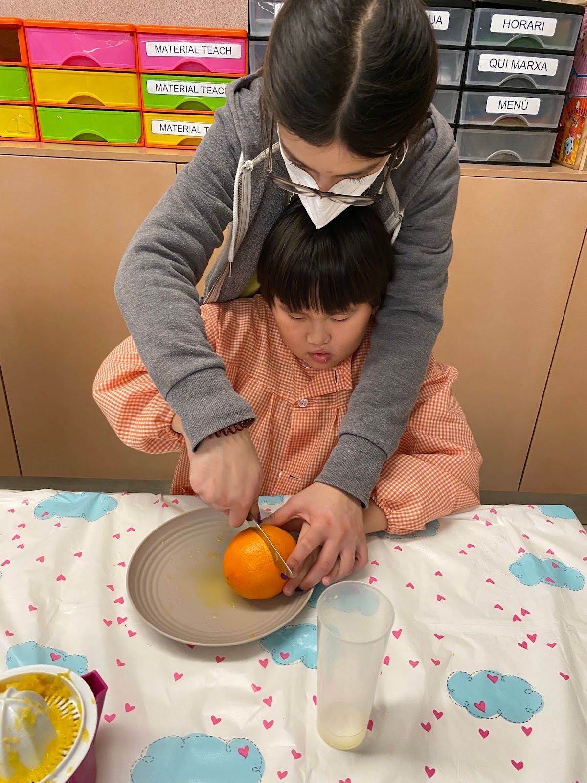 (comptar quantes taronges, la meitat..), el color, el gust… També la motricitat